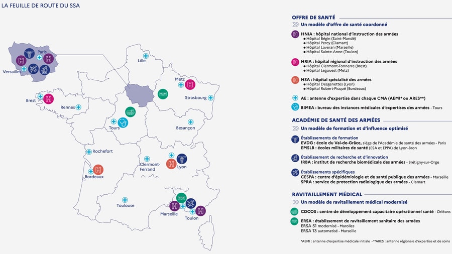 Pour s’adapter aux nouveaux enjeux stratégiques, l’organisation d’un nouveau format des hôpitaux est en cours (en référence à la feuille de route 2024-2030 du SSA). Ils sont alors divisés selon 3 capacités différenciées et en fonction de leur offre de santé au profit des militaires nous retrouvons :